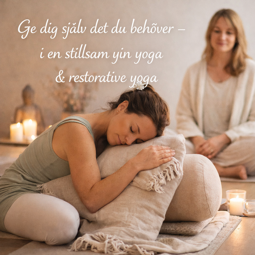 Restorative yoga – start vecka 17 (6 tillfällen) Start söndag 26/4 Tänk dig att få bli omhändertagen i en varm, stilla stund… Där kroppen vilar tungt, stödd av massa kuddar, bolster, filtar och du sakta får släppa taget. Jag guidar dig varsamt genom yoga nidra, meditationer och djup avslappning. Ibland får du bara lyssna till stilla musik, till ord, till en dikt eller en saga som får dig att sjunka ännu djupare in i vila. Det är en paus där kroppen får vila och själen får komma ikapp. En stund att längta till. Tider: Söndagar 11:00 eller 19:00 Pris:900 kr / kurs Drop-in 180 kr Begränsat antal platser – säkra din plats i tid